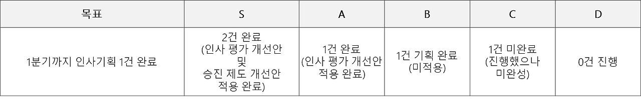 - 예) 1분기까지 인사평가 개선 80% 완료
